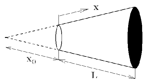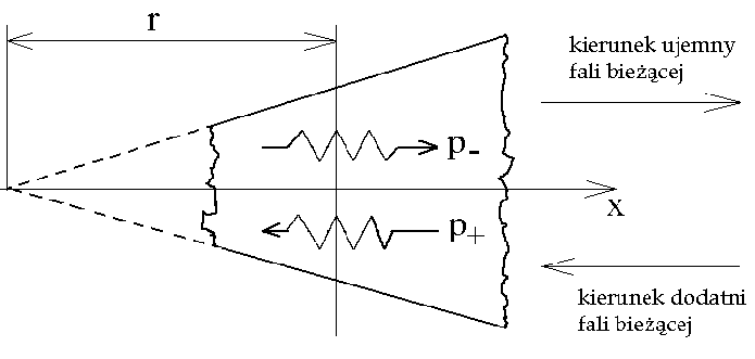 Rozwiązanie równania falowego dla fal sferycznych w słupie powietrza o kształcie konicznym przyjmuje postać [17]: