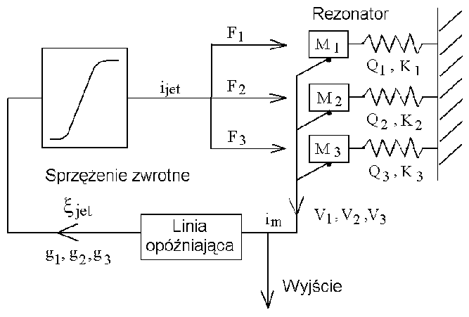 Składniki vi w powyższym równaniu odpowiadają numerycznie prędkościom oscylatorów mechanicznych będących modelem rezonatora instrumentu (korpusu piszczałki), (rys.3.5). Powstające w rezonatorze drgania wpływają na strumień powietrza pobudzający słup powietrza w rezonatorze do drgań. Powoduje to wzmocnienie odchylenia strumienia powietrza na wardze instrumentu i opóźnienie poprzecznej fali zaindukowanej w strumieniu pobudzającym. Opóźnienie to jest, w ogólności, zależne od numeru danego modu (dokładniej jego częstotliwości). Stąd też element opóźniający zastosowany w zaprezentowanym modelu wprowadza opóźnienie tdelay zależne od częstotliwości: