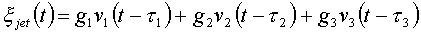 gdzie ti określa wnoszone opóźnienie, a gi wzmocnienie odchylenia strumienia na wardze instrumentu, dla i-tego modu. Zastosowany w omawianym modelu rezonator, dla uproszczenia rozważań, nie uwzględnia szeregu istotnych zjawisk zachodzących w samym korpusie instrumentu. Metody modelowania tych zjawisk, do których zalicza się między innymi wpływ kształtu korpusu na propagację fal akustycznych w jego wnętrzu (odbicia) i widmo generowanego dźwięku, zostaną opisane w dalszej części niniejszego rozdziału. W modelu z rys.3.5 rezonator symulowany jest przez trzy proste oscylatory, odpowiadające trzem modom generowanego sygnału (i = 1, 2, 3). Każdy z oscylatorów opisany jest przez jego sprężystość K, dobroć Q oraz masę M. Odchylenie strumienia powietrza na wardze instrumentu wywołuje zmienny przepływ strumienia powietrza ijet(t) do rezonatora (pobudzenie rezonatora do drgań), co opisane jest zależnością [8]: