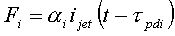 opisuje aproksymowany stosunek prędkości strumienia powietrza w danej chwili do jej wartości końcowej, co wprowadza do rozważań wielkość P(t) związaną z ciśnieniem powietrza dostarczanego do instrumentu. Zależność (3.5) opisuje nieliniowość interakcji pomiędzy strumieniem powietrza wdmuchiwanego do instrumentu a drganiami wywołanymi w rezonatorze. Nieliniowość ta ma charakter funkcji tangensa hiperbolicznego (Fletcher [3], McIntyre, Schumacher, Woodhouse [9]), co opisane zostało w rozdziale 2.3.4. Wielkość x0 w równaniu (3.5) określa początkowe odchylenie centralnej części strumienia powietrza od krawędzi wargi instrumentu. Konieczność uwzględnienia tej wielkości wynika z faktu, iż nie zawsze strumień powietrza zasilającego piszczałkę jest kierowany centralnie na jego wargę, co ma istotny wpływ na brzmienie instrumentu (dźwięk generowany przy wykorzystaniu modelu matematycznego instrumentu). Wielkość ta oznaczona przez h0 uwzględniona została na rys.2.12. Dokładne rozważania na temat kształtowania strumienia powietrza zasilającego piszczałkę i jego interakcji z wargą instrumentu, poparte opisem matematycznym omawianych zjawisk, przedstawione są szeroko w literaturze [14], [15]. Siła Fi oddziałująca na i-ty oscylator układu rezonatora (rys.3.5) określona jest zależnością [8]: