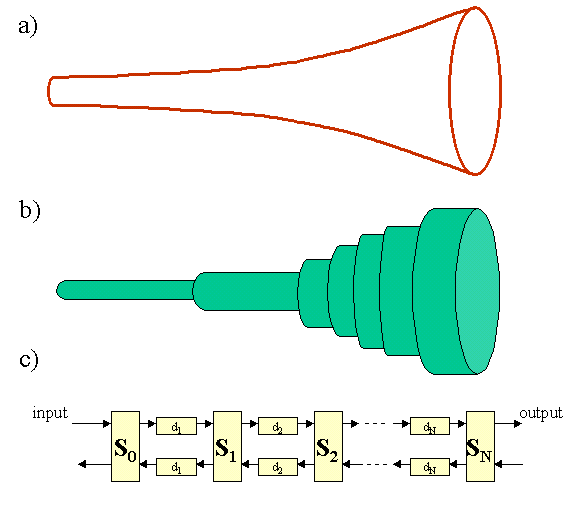 The picture (a) presents the body of the modelled instrument. The picture (b) describes a digital waveguide modeling the propagation of the wave (assumming that there is no loss in the wave-guide). The level of the sound pressure in each point of the wave guide is equal to the sum of the values of the traveling and reflected wave. The picture (c) models a tube, whoch length is limited. The (Fa) filter is related to the reflection of the sound from the edge of the mouth of the open pipe or from the end of the closed one. The filter is a downpass filter, because simulates the damping of the high frequencies during propagation. The (Ft) filter is a highpass transmission filter, because the emiision of the sound through the mouth of the pipe rises with the frequency. The picture (4) presents a certain simplification of the picture (3). That model is called quasi-physical model. The pair of the delay lines has been substituted by the only one two times longer delay line. The propagation loss in the wave guide is determinated by the multiplier (r). The quasiphysical model has not been constructed due to the physical emission of the sound (It is assumed that the wave is not emited from that same point as in the physical instrument). The experiments showed that the reality of sound is similar to the physical model. The presented description was related to the cylindric shape of the instrument. In the case of very complicate shape the body of the instrument can be modelled by the use of the finite number of small tubes or cones.