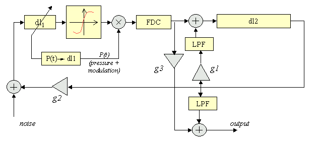 As It has been described before the physical model simulate aticulation effects (vibrato, tremolo) as they can be done in a natural instrument. An instrument is simulated bu the use of two digital delay lines (The lines are two times shorter than the instrument). The place, when the effects origin are describde in the picture (the plice described 'pressure + modulation')