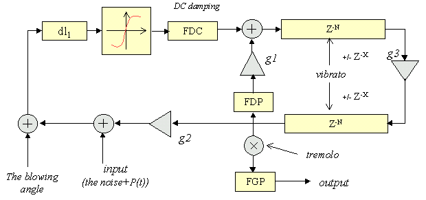 The quasi-physical model was invented by dr.sc.Slawomir Zielinski (Technical University of Gdansk. Poland). The articulation is modelled in the simplificated way. The tremolo effect (cyclic amplitude change) is simulated at the end of the wave-guide model. The vibrato effect (cyclic freuency modulation) is performed by the modulation of the length of the digital delay line.