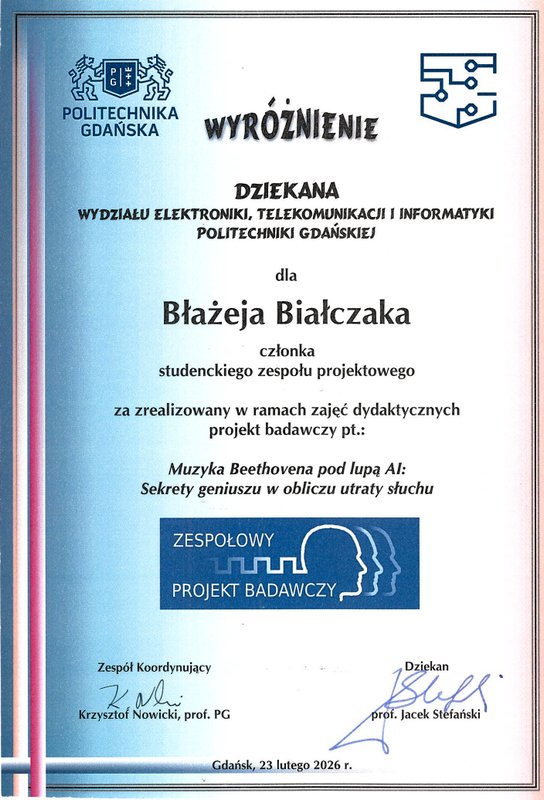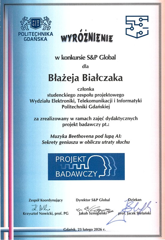 Projekt pt. Muzyka Beethovena pod lupą AI: Sekrety geniuszu w obliczu utraty słuchu, (kierownik projektu: Błażej Białczak), zrealizowany pod opieką prof. Bożeny Kostek, uzyskał dwa wyróżnienia: w konkursie Dziekana WETI oraz w konkursie S&P Global.