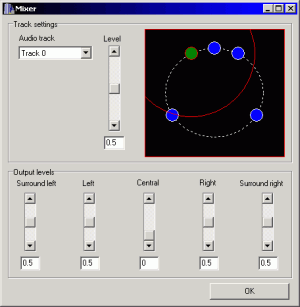 For each track, the position of the virtual sound source in the surround sound image may be set using the mixer window. The virtual sound source, represented as a green circle in the plot, may be moved in the surround sound image with the mouse, blue circles represent the position of the speakers in the 5.1 system. The sound source level (the range of the source) is represented as a red circle and it may also be changed by the user. When the signals from all tracks are sent to the sound card output, they are mixed to the standard 5.1 signal. The level of the signal in each of the five surround channels may be altered using the sliders at the bottom of the mixer window.
