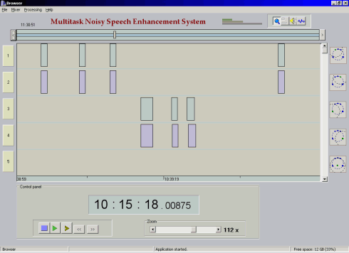BrowserThe Browser application allows user to examine sound files containing recorded speech signals, prepare them for processing in the Restorer application and listen to the restored recordings. The application is optimised for working with the sessions created using the Recorder but separate sound files may also be used. A novel approach implemented in the described system is the synchronous playback of the multiple recordings of the same speech signal made from different sources (e.g. several radio stations), using the multichannel surround sound system. It has been verified empirically that with this approach, listening conditions and speech intelligibility is greatly improved. If the multiple recordings of the noisy speech signal are played back from different speakers of the surround system, the listener precisely localises the virtual source of the correlated speech signal in one defined point of the surround sound image, while the non-correlated noise and distortions are heard from various points of the sound image. Therefore, it is easier for the listener to focus on the message contained in the speech signal. To use these capabilities of the system, a multichannel sound card has to be present in the computer that runs the Browser application and the surround speaker system with the proper amplifier must be available. A typical 5.1 home theatre system may be used (the system does not make use of the low frequency channel, so the subwoofer is not needed). The graphical user interface is similar to the one used in the Recorder application. Multiple playback tracks are available, each track is represented as a timeline in the application window. Each sound file is represented as a box (rectangle), placed on one of the timelines. Double clicking on the block starts playback of the corresponding sound file or opens the sound file in the Restorer application, depending on the option selected in the application toolbar. The Browser application provides also simple editing options. The user may move the boxes representing sound files along timelines or between the tracks by dragging the boxes with the mouse. It is recommended to place all sound files recorded from the same source in one track.