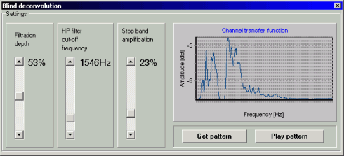 Blind deconvolutionThe blind deconvolution module removes linear distortions introduced to the signal by the transmission channel. These distortions modify the signal spectrum: some frequency bands are amplified and other bands are attenuated. This results in unnaturally sounding speech. The blind deconvolution module uses the same algorithm as the noise whitening module. The main difference is that a speech signal (the pattern) is used in the processing instead of part that contains only noise. Ideally, the pattern should contain only speech signal from the same speaker as in the processed recording and it should not contain any noise. The aim of the processing is to match the spectrum of the parts of recording that contain speech signal to the spectrum of the pattern. The algorithm works as follows: