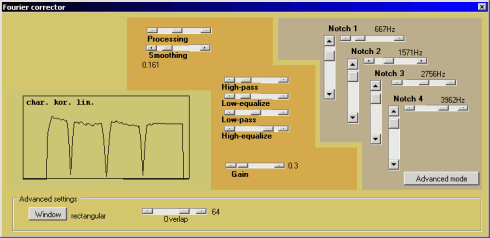 Fourier correctorThe aim of the Fourier corrector module is to modify the signal spectrum in order to make it similar to the reference speech pattern (speech signal recorded in good acoustic conditions) and to remove distortions using the digital filters. Average spectrum of the pattern is computed using the spectrum analyser module and saved to a disk. The Fourier corrector module computes average spectrum of the recording and correction function is determined by dividing both average spectra: