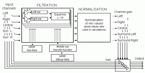NormalisationWhen the multiple recordings of the speech signal are used in the multichannel playback in the Browser application, all of these signals should have equal loudness. The normalisation module was designed for this task. A root-mean-square (rms) value of the signal is used as an estimate of its loudness. The normalisation algorithm processes all signals so that their rms value of each signal is the same. Before the rms value is determined, signals are filtered in order to take into account factors such as sound source position relative to the listener and spatial sound filtration by the listener's body. Head related impulse responses (HRIR), recorded in the anechoic chamber using the microphones placed in the ears of the mannequin, are used in the filtration. Two sets of HRIR functions, related to the speakers placement corcondant with the ITU-R standard, are used in the algorithm: free field HRIR (by Keith and Gardner) and diffuse field HRIR. In the diffuse field method, HRIR functions are normalised to the average of all functions (or to one of the functions). The normalisation process eliminates the influence of the recording devices on the recorded HRIR functions (i.e. difference between the frequency responses of the microphones inside the mannequin and the reference microphone used to determine the frequency response of the test loudspeaker). The normalisation procedure also eliminates the filtering effect of the ear. Therefore, the recorded diffuse field HRIRs are additionally filtered with the transfer function of the outer and middle human ear. Monophonic sound signals are filtered using the selected HRIR functions (separate HRIR function for left and right ear). After the filtering, rms values are calculated for each signal. Next, for each signal, the gain needed to obtain equal rms value is determined. The obtained gain values are corrected in order to prevent signal clipping. Finally, all signals are processed according to the calculated gain levels.
