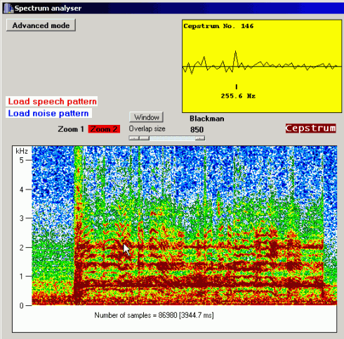 y[n] - analysed signal The average spectrum plot is useful if the user needs to determine frequency bands where noise and distortions are present. Additionally, using this plot, parts of the recording may be classified as 'noise' or 'signal' and saved to a file as a pattern. To plot average spectrum, the user needs to select the part of recording that will be used in computation, in the sonogram. Power cepstrum The power cepstrum of the signal is computed using the cosine transform in the segment selected by the cursor in the sonogram and presented in the second plot. Frequency range up to ca. 2200 Hz is analysed (almost all energy related to voice phonemes is situated in this frequency range). Power cepstrum is computed using the instantaneous spectrum of the selected signal segment: