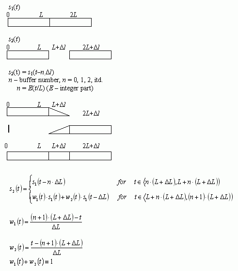 Time stretchingThe time stretching module prolongs the time of the recording without affecting the voice pitch (the glottal tone frequency is not changed). Up to 100% longer playback time may be obtained (two times the original playback time). Two time stretching methods are available: interbuffer overlapping and intrabuffer overlapping. Additionally, cepstral analysis is implemented for estimation of glottal tone frequency, to maintain phase continuity. Interbuffer overlapping The signal is divided into segments, 1024 samples each. These segments are 'moved apart' on the time line, and the spaces between segments are filled with estimated samples. Estimation is performed using linearly weighted averaging of samples from the previous and the next signal section in order to minimize phase distortion and maintain signal continuity.
