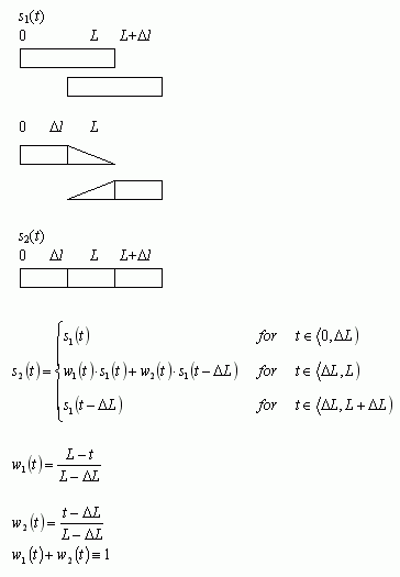 If the signal is periodic or quasi-periodic (glottal tone is present), the stretching factor depends on the fundamental frequency of the signal and is the multiple of the signal period. The cepstral analysis is used as glottal tone detector and the estimator of its frequency. Intrabuffer overlapping The signal is divided into segments, 1024 samples each. A copy of each segment is created and shifted in time, so that the original segment and its copy partially overlap. The sample values in the overlap region are computed as the linearly weighted average of sample values in the original section and its copy.
