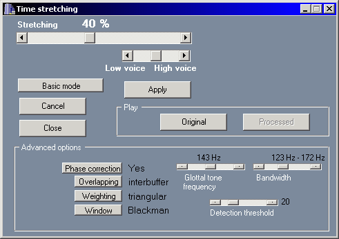 If the signal is periodic or quasi-periodic (glottal tone is present), the stretching factor depends on the fundamental frequency of the signal and is the multiple of the signal period. The cepstral analysis is used as glottal tone detector and the estimator of its frequency. --- The glottal tone detector uses cepstral analysis performed by means of cosine transform. Instantaneous power cepstrum of the signal is computed from the single signal section (1024 samples). The algorithm seeks for a local maximum of the cepstrum in the frequency range ca. 78 - 719 Hz (in most case, the glottal tone frequency is within this range). The user may change the frequency range used in analysis to obtain better results - sonogram and cepstrum plot of the recording, obtained using the spectrum analyser module, are helpful in determining the changes in glottal tone frequency. Additionally, the algorithm for tracking the local cepstrum maximum is implemented by time-windowing of the cepstral coefficients. If the speech signal segment is unvoiced, the detected maximum of the cepstrum is ignored, according to the detection threshold set by the user. As a result, the glottal tone detector function is not affected by distortions that mask the speech signal. The glottal tone frequency is estimated from the local cepstrum maximum found by the detector, using the second order interpolation. The time stretching module window allows user to set the stretching factor (0% - 100%) and the expected glottal tone frequency (low voice - high voice). Additional parameters may be set in the advance mode: overlapping method, phase correction, weighting function (rectangular or triangular), time window, frequency range used by the glottal tone detector and the detection threshold.
