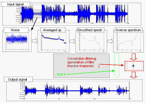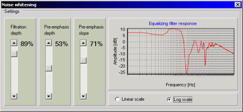 Noise whiteningThe noise (and other additive distortions) usually has non-flat amplitude spectrum. The noise whitening module equalizes the spectrum of the signal, making it similar to the white noise spectrum. Noise whitening module works similarly to the automatic filter that enhances low level spectral components and attenuates high level ones. Additionally, de-emphasis is applied after whitening (high frequencies are attenuated), so that spectrum of processed signal is similar to the spectrum of speech signal (which has low energy in high frequency range). Whitening and de-emphasis enhance the quality of the speech signal. This module is especially useful if constant "whistling" is present in the recording. The algorithm starts with finding the part of the recording that contains only noise and no speech signal. This part is segmented and the spectrum is calculated for each segment. The noise estimate is calculated as a smoothed (low-pass filtered) noise spectrum averaged in all segments. This estimate is inversed and used in restoration of the speech signal.