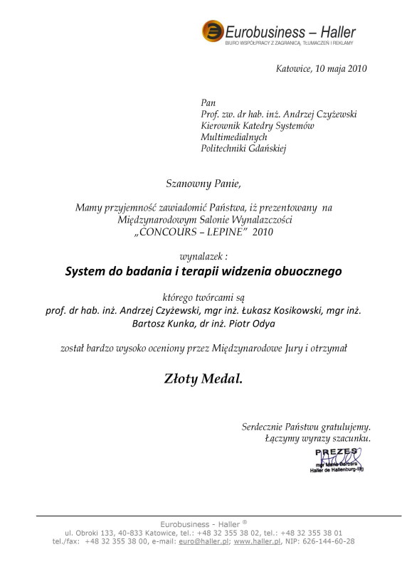 Multimedia Systems Department, was awarded a gold medal in the Student