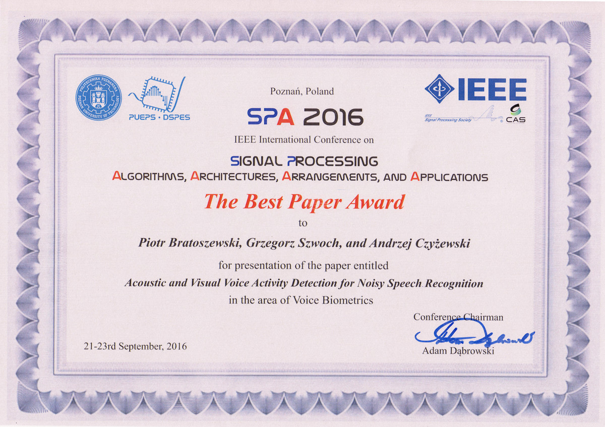 odbyła się w dniach 21-23 Września 2016 w Poznaniu. Nagrodzony referat nosi tytuł: Acoustic and Visual Voice Activity