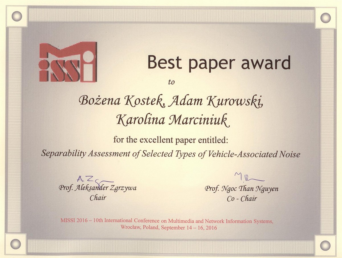 W dniach 13-15 października, w Rzeszowie, odbyło się XVI Międzynarodowe Sympozjum Nowości w Technice Audio i Wideo NTAV2016. Referat pt.: Analysis of soundscape recordings in close proximity to the road in changeable weather conditions, wygłoszony przez mgra inż. Adama Kurowskiego, przygotowany przez zespół w składzie: mgr inż. Karolina Marciniuk, mgr inż. Adam Kurowski, prof. dr hab. inż. Bożena Kostek, otrzymał pierwszą nagrodę za prezentację referatu przez młodego pracownika, przyznaną przez Prezydium Zarządu Polskiej Sekcji Audio Engineering Society.