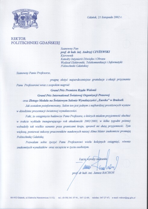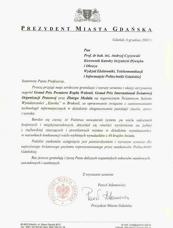 Prezydent Miasta Gdańska Paweł Adamowicz nadesłał list gratulacyjny dla prof. Andrzeja Czyżewskiego z okazji przyznania nagród na 51. Światowym Salonie Wynalazczości "Eureka" w Brukseli.
