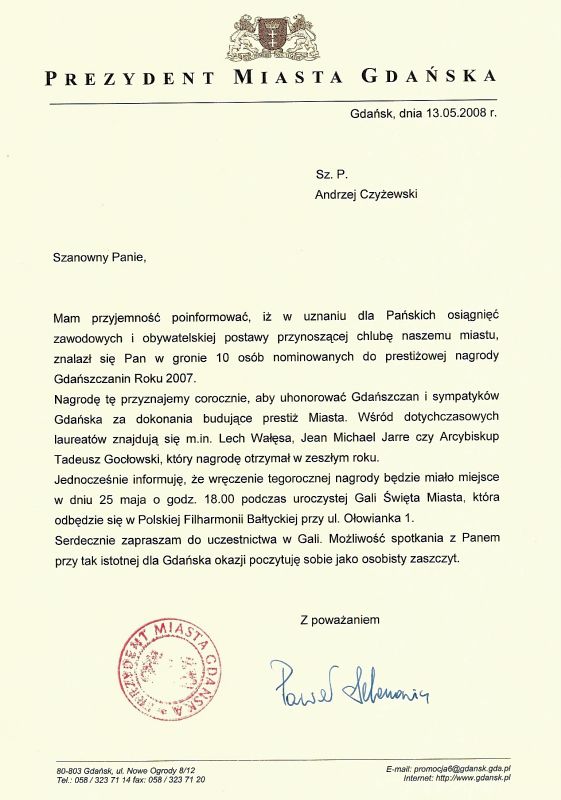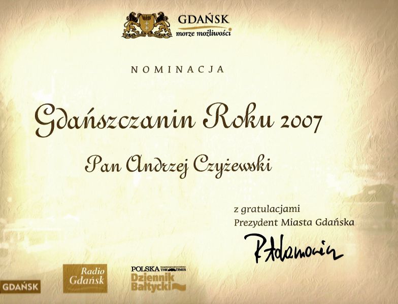 Prof. Andrzej Czyżewski otrzymał nominację do Nagrody Gdańszczanina Roku 2007. Uroczystość uświetnił koncert, w którego programie znalazł się wspaniały występ dzieci z Gdańskiego Instytutu Suzuki. Laureatem tegorocznej nagrody został Marian Kołodziej, malarz, scenograf, projektant ołtarzy papieskich. Prof. Czyżewski był jedną z 10 nominowanych osób i w gronie tym reprezentował gdańskich naukowców. Jedną z nominowanych postaci był też absolwent naszego Wydziału, Waldemar Kucharski, obecnie Prezes firmy Young Digital Planet S. A. List gratulacyjny, dyplom i fotografie z uroczystości wręczenia nagrody, która odbyła się w Filharmonii Bałtyckiej w dniu 25 maja 2008 r. zamieszczono poniżej.