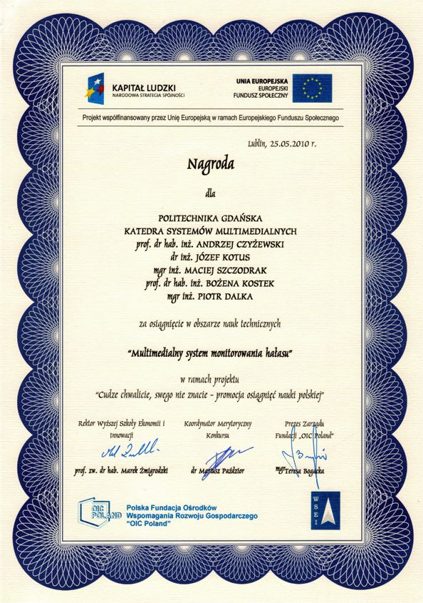 mgr inż. Piotr Dalka za Multimedialny system monitorowania hałasu.