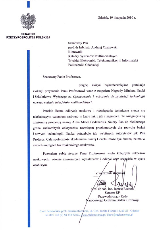 List gratulacyjny dla Prof. A. Czyżewskiego