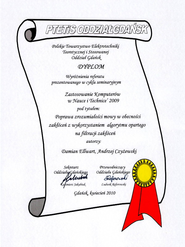 Referat autorstwa mgr. inż. Damiana Ellwarta i prof. Andrzeja Czyżewskiego pod tytułem "Poprawa zrozumiałości mowy w obecności zakłóceń z wykorzystaniem algorytmu opartego na filtracji adaptacyjnej" został wyróżniony przez Polskie Towarzystwo Elektrotechniki Teoretycznej i Stosowanej, Oddział Gdańsk. Referat był prezentowany w cyklu seminaryjnym Zastosowanie Komputerów w Nauce i Technice '2009.