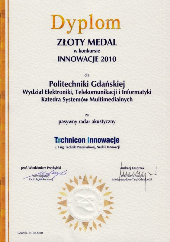 Pasywny Radar Akustyczny zrealizowany w Katedrze Systemów Multimedialnych PG nagrodzony został złotym medalem w konkursie Innowacje 2010, odbywającym się w ramach 6. Targów Techniki Przemysłowej, Nauki i Innowacji TECHNICON-INNOWACJE. Opracowane urządzenie wykorzystuje wyniki analizy kierunku napływania fal akustycznych do kierowania wizyjnymi kamerami obrotowymi.