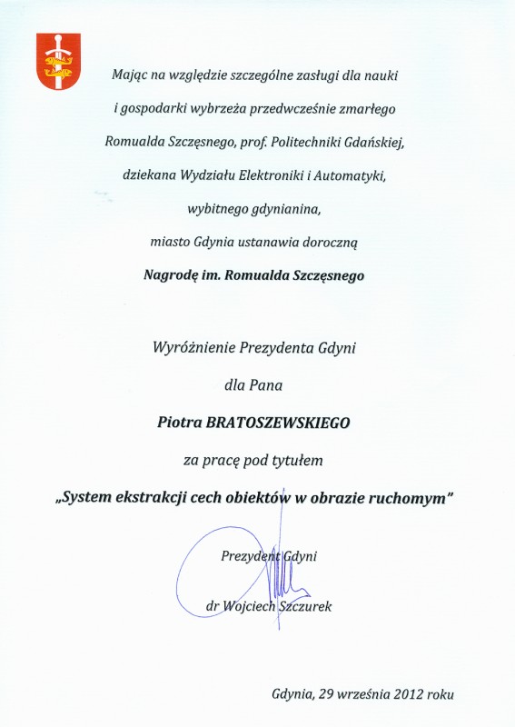 obrazie z kamery wideo. Nagroda została ufundowana przez Prezydenta Miasta Gdyni.