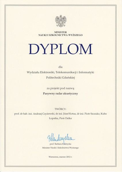 - Pasywny radar akustyczny - opracowany w ramach projektu MAYDAY EURO 2012, nagrodzony Złotym Medalem Międzynarodowych Targów Poznańskich podczas salonu Nauka dla Gospodarki oraz Złotym medalem wystawy wynalazków Brussels Innova 2011
