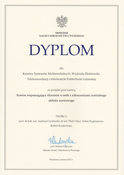 - System wspomagający słyszenie u osób z zaburzeniami centralnego układu nerwowego - opracowany w ramach projektu Typoszereg, nagrodzony Złotym medalem 7. Targów Techniki Przemysłowej, Nauki i Innowacji - Technicon - Innowacje 2011 oraz Złoty medalem wystawy wynalazków Brussels Innova 2011