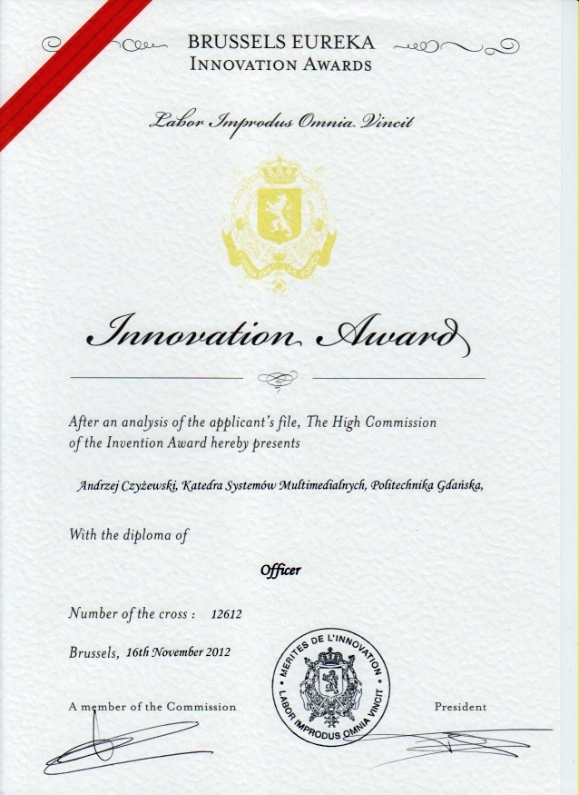 W dniach 15-17 listopada 2012 w Brukseli, odbyły się 61. międzynarodowe targi wynalazków Brussels Innova. Z okazji tego wydarzenia zostały przyznane odznaczenia Prezydenta Miasta Brukseli dla wybitnych wynalazców.Prof. Andrzej Czyżewski został uhonorowany Krzyżem Oficerskim Orderu Wynalazczości, wręczonym w urzędzie miasta Brukseli (Krzyż Kawalerski tego Orderu otrzymał w 2009 r.)