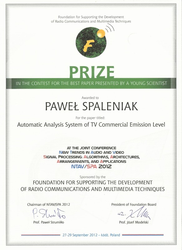 Nagroda za najlepszy artykuł autorstwa młodego naukowca na konferencji NTAV/SPA 2012