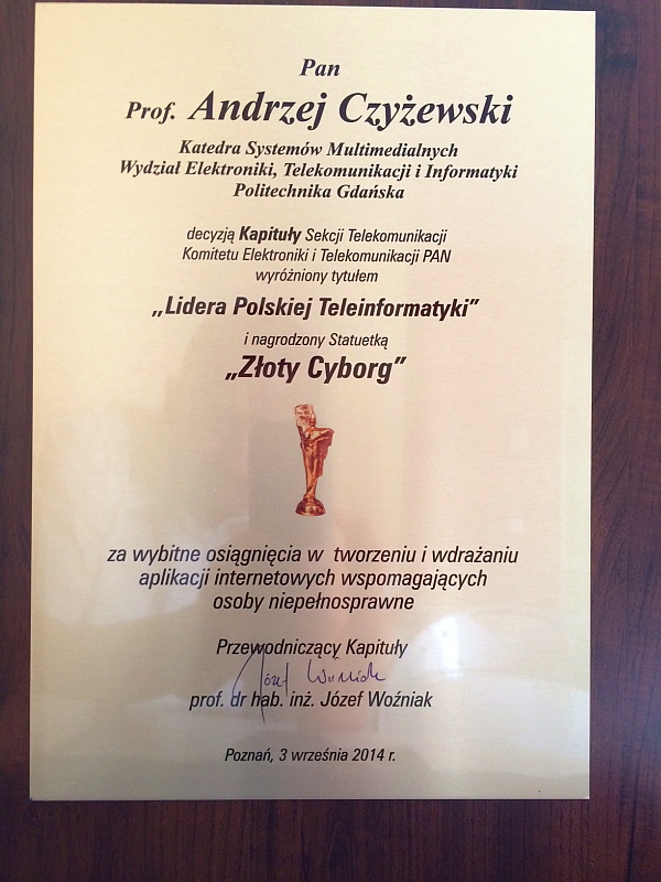 Decyzją Kapituły Sekcji Telekomunikacji Komitetu Elektroniki i Telekomunikacji PAN, prof. Andrzej Czyżewski (Katedra Systemów Multimedialnych) został wyróżniony tytułem Lidera Polskiej Teleinformatyki i w dn. 3. 09. 2014 r. w Poznaniu nagrodzony statuetką Złoty Cyborg (ufundowaną przez firmę Sprint S. A.) za “wybitne osiągnięcia w tworzeniu i wdrażaniu aplikacji internetowych wspomagających osoby niepełnosprawne”.