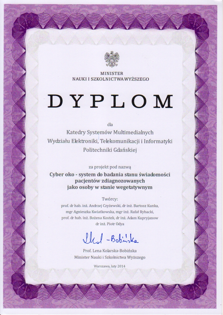 - System Cyber-Oko umożliwiający diagnozę świadomości u pacjentów w stanie wegetatywnym opracowany w ramach projektu Typoszereg interfejsów multimodalnych, nagrodzony Złotym Medalem z wyróżnieniem podczas 62 Międzynarodowych Targów Wynalazczości, Badań Naukowych i Nowych Technik BRUSSELS INNOVA.
