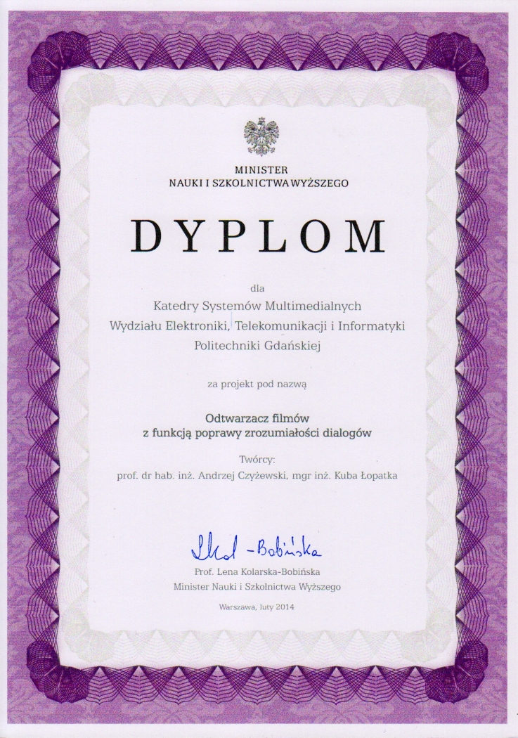 Zespół pod kierownictwem prof. dr. hab. inż. Andrzeja Czyżewskiego z Wydziału Elektroniki, Telekomunikacji i Informatyki Politechniki Gdańskiej otrzymał Pierwszą Nagrodę Prezesa Rady Ministrów za osiągnięcia naukowo-techniczne w 2013 r. W skład zespołu laureatów z Katedry Systemów Multimedialnych wchodzą: prof. dr hab. inż. Bożena Kostek, dr inż. Bartosz Kunka, mgr Agnieszka Kwiatkowska, dr inż. Piotr Odya oraz mgr inż. Rafał Rybacki.