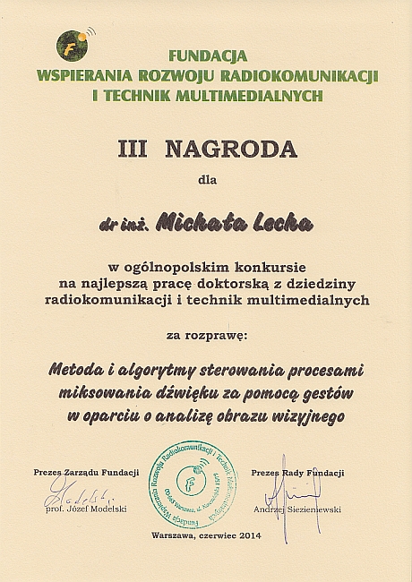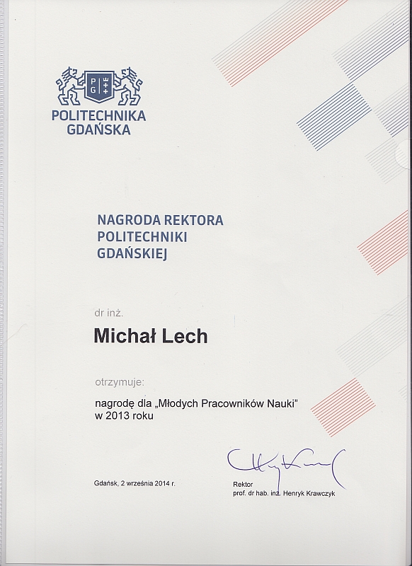 roku akademickiego 2014/2015, dr inż. Michał Lech otrzymał nagrodę dla