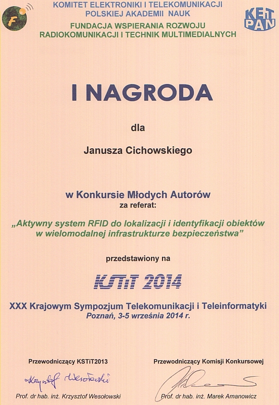 Pierwsza nagroda w Konkursie Młodych Autorów została przyznana dla mgr inż. Janusza Cichowskiego (współautor artykułu: prof. dr hab. inż. Andrzej Czyżewski) za referat pt. Aktywny system RFID do lokalizacji i identyfikacji obiektów w wielomodalnej infrastrukturze bezpieczeństwa. Nagrody zostały przyznane przez Komitet Elektroniki i Telekomunikacji Polskiej Akademii Nauk i ufundowane przez Fundację Wspierania Rozwoju Radiokomunikacji i Technik Multimedialnych.