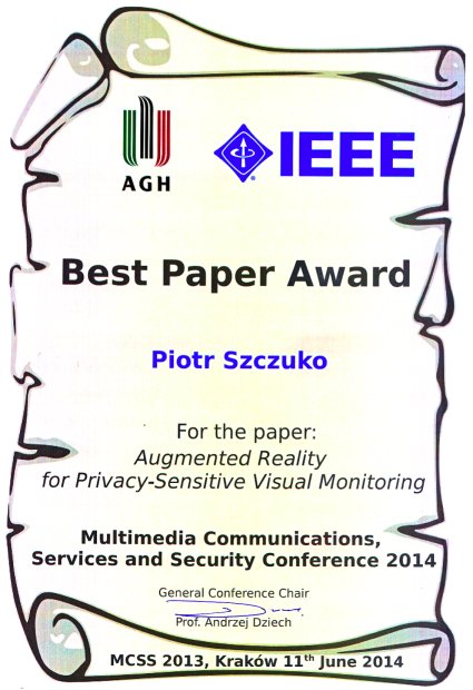Referat Augmented Reality for Privacy-Sensitive Visual Monitoring dra Piotra Szczuko z Katedry Systemów Multimedialnych został nagrodzony nagrodą Best Paper Award na międzynarodowej konferencji Multimedia Communications, Services and Security MCSS 2014, która odbyła się 11 czerwca 2014 w Krakowie.