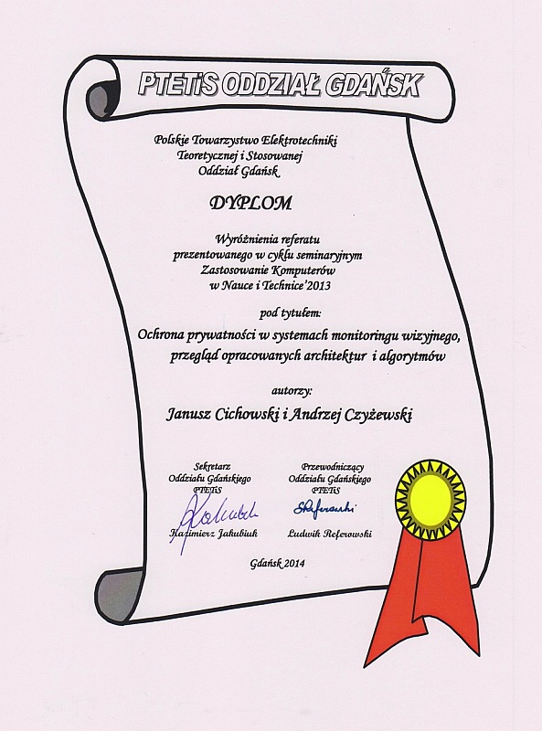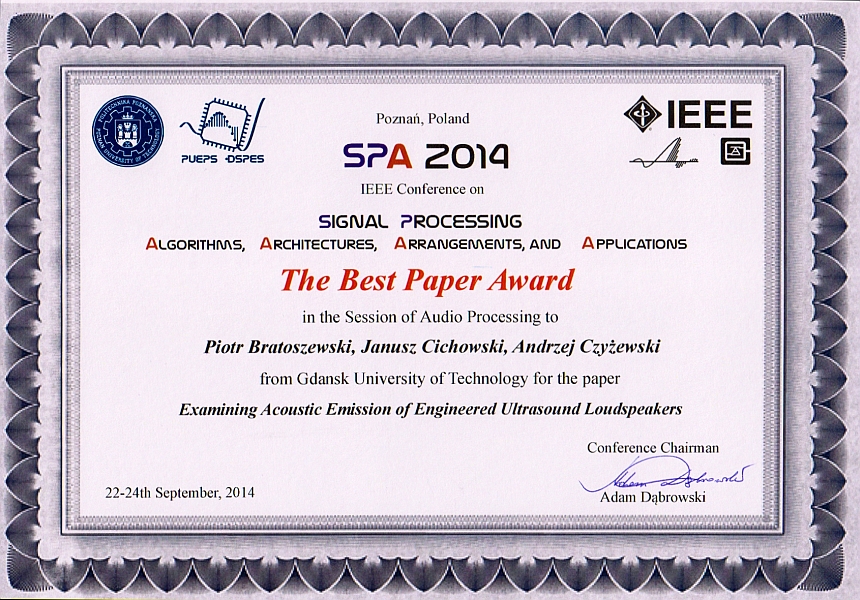 Referat pt. Examininig Acoustic Emmission of Engineered Ultrasound Loudspeakers wygłoszony przez mgr inż. Janusza Cichowskiego (współautorzy artykułu, mgr inż. Piotr Bratoszewski, prof. dr hab. inż. Andrzej Czyżewski) otrzymał nagrodę The Best Paper Award.