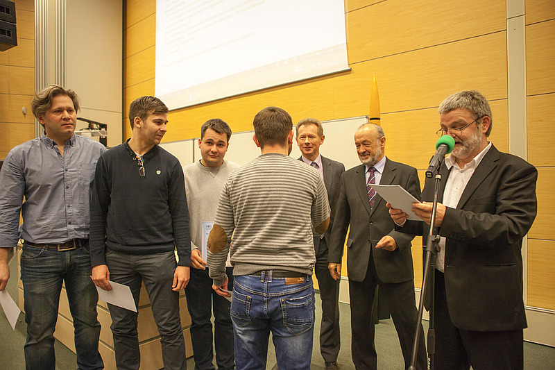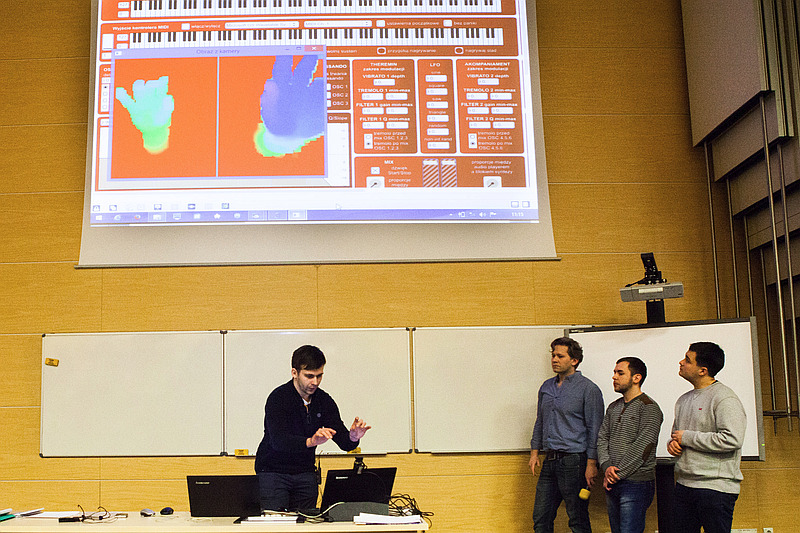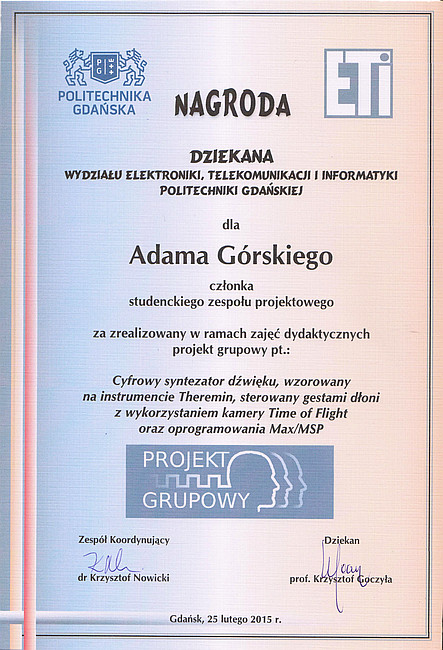 Z przyjemnością informujemy, że projekt grupowy o tytule „Cyfrowy syntezator dźwięku, wzorowany na instrumencie Theremin, sterowany gestami dłoni z wykorzystaniem kamery Time of Flight oraz oprogramowania Max/MSP” otrzymał dnia 25.02.2015 nagrodę Dziekana Politechniki Gdańskiej w konkursie na najlepsze projekty grupowe edycji 2014/2015. Opiekunem projektu był pracownik Katedry Systemów Multimedialnych mgr inż. Piotr Bratoszewski, w skład zespołu projektowego wchodzili: Adam Górski (kierownik), Andrzej Bachanowicz, Łukasz Suski, Rafał Siemiątkowski.