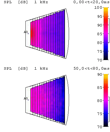 Jedno z wielu możliwych w programie Catt Acoustic obliczeń pozwala uzyskać rozkłady ciśnienia akustycznego w następujących po sobie okresach czasu. Zobrazowanie wyników znajduje się poniżej.