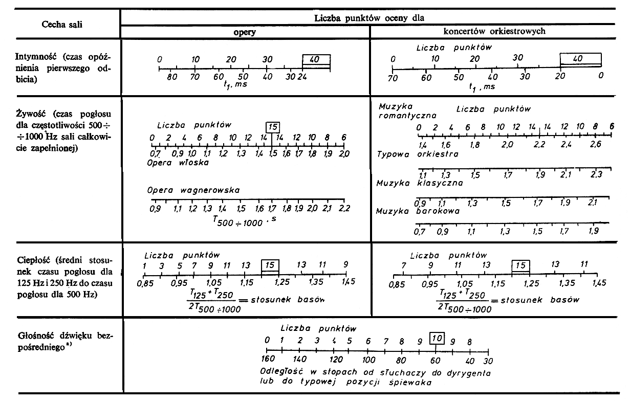 Poniżej przedstawiono skalę ocen sal operowych i koncertowych zaproponowaną przez L.L. Beranka: