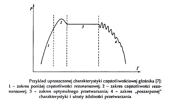 Charakterystyką przenoszenia (charakterystyką częstotliwościową) nazywa się przebieg ciśnienia akustycznego, mierzonego na osi symetrii głośnika w określonej od niego odległości, w funkcji częstotliwości przy stałej wartości napięcia doprowadzonego do zacisków głośnika. Na rysunku została przedstawiona uproszczona charakterystyka przenoszenia głośnika.