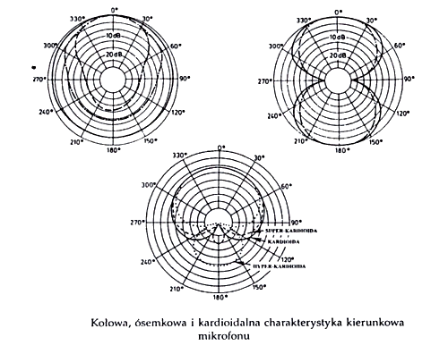 Charakterystyka kierunkowości - jest to wykres w układzie współrzędnych biegunowych przedstawiający stosunek skuteczności mikrofonu przy określonej częstotliwości i przy danym kącie padania do maksymalnej skuteczności mikrofonu dla kąta padania równego 0°. Rysunek przedstawia przykładowe charakterystyki kierunkowe mikrofonów.