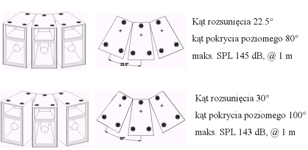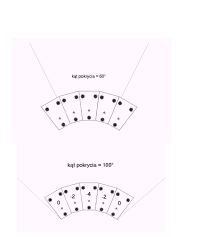 Jak widać, im większy jest kąt rozsunięcia poszczególnych zespołów głośnikowych, tym mniejszy zysk poziomu natężenia dźwięku